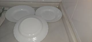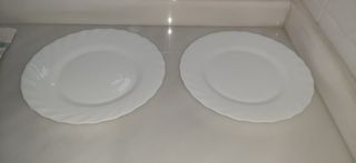 Set de platos de porcelana con un diseño elegante. - Color blanco con un sutil ribete azul. - Pecio: 1€ cada uno. - Tenemos: blancos planos 2 unidades. - Blancos hondos 5 unidades. - Ribete azul planos 6 unidades. - Ribete azul hondos 6 unidades. - Material de porcelana de alta calidad.