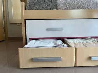 Cama nido de 90cm con espacio de almacenamiento. - Estructura de madera. - Cajones integrados para guardar ropa o accesorios. - Diseño moderno en tonos beige y blanco.