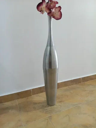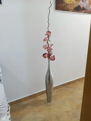 Florero metálico con flores artificiales orquídeas