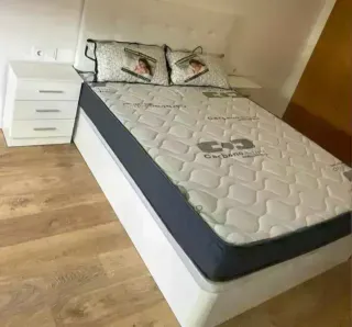 Se vende canapé de matrimonio con colchón. - Base de canapé blanca. - Colchón con funda gris y detalles plateados.