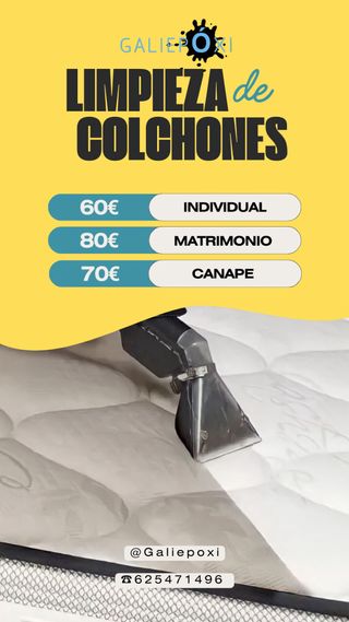 Ofrezco servicio de limpieza profesional de colchones. - Limpieza a fondo de colchones individuales, de matrimonio y de canapé. - Precios: 60€ individual, 80€ matrimonio, 70€ canapé. - Contacta al 625471496 o @Galiepoxi