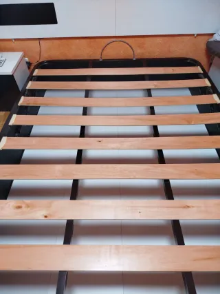 Base de cama tipo canapé con somier de láminas. 2 Laminas de los pies con pequeña grieta. - Medidas: 150x190 cm. - Estructura metálica. - Láminas de madera.