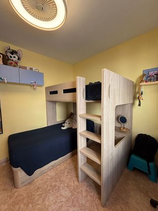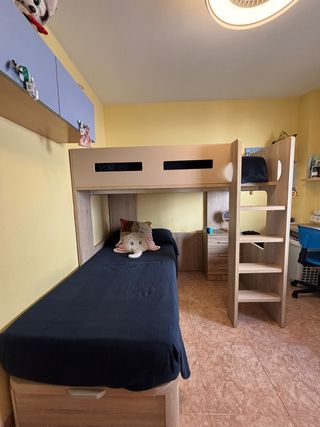 Cama litera de madera en color cerezo. Ideal para habitaciones juveniles. - Estructura robusta y resistente. - Diseño compacto y funcional. - Incluye escalera de acceso al piso superior. - Incluye colchón superior, medida especial 1,80 × 90 con somier (como se ve en la foto) - Incluye mesilla de noche, con tres cajones, 67cm alto, 33cm profundidad y 46cm ancho. - Cama inferior con Canapé, gran capacidad (no incluye el colchón) - Perfecto estado de conservación.
