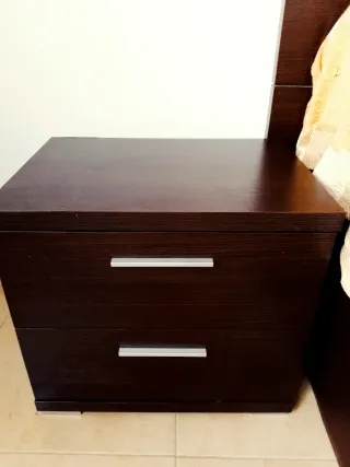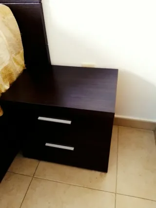 Se vende conjunto de muebles de dormitorio. - Incluye canapé, cabezal y dos mesitas de noche. - Acabado en madera oscura. - 1,35m.X2m. La vendo por mudanza