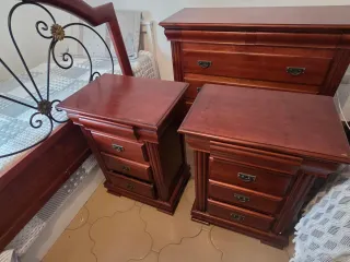 Conjunto de dormitorio con estructura de madera y detalles de forja. - Cabecero con diseño curvo y adornos florales. - Estructura de cama robusta. - Mesita de noche a juego con cajones. -Comoda de de 3 cajones. _Cama de 90 con Cabecero +colchón +canapé 150€ Se vende tambien por separado