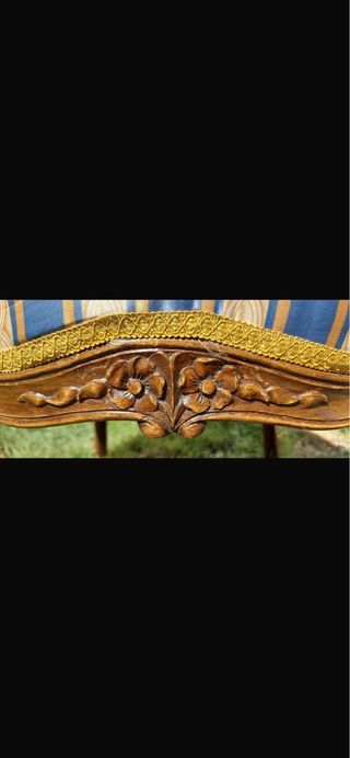 Lote formado por una pareja de butacas , una silla y un canapé españoles de madera de palisandro. Estilo Luis XV. Espoca Isabelina . Tercer cuarto del siglo XIX . Tapiceria a rayas azules y amarillas. Medidas; Butacas: 92x 52 x 59 cm Canapé: 92 x 112 x 59 cm Copete y arranques en motivo floral y patas cabriolé. Total lote: 1726€. Nonincluido transporte