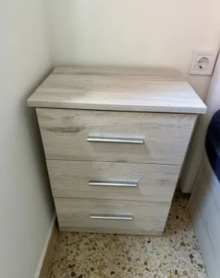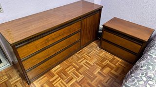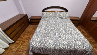 Conjunto de muebles para habitación de matrimonio. - Cómoda de madera oscura con varios cajones. - Mesitas de noche a juego. - Cama con cabecero de madera y canapé 📏Cómoda de de 140 x 45cm 📏Mesillas de noche de 62 x 37cm 📏Cama de 135cm con canapé