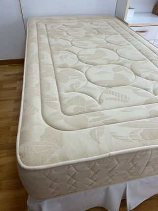 Se vende cama completa con canapé hermético y colchón. - Colchón: 105x190. Altura 28 cm - Canapé: 105x190. Altura 30 cm - Color beige y blanco. - Estructura de madera y tapizado en tela.