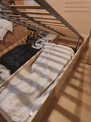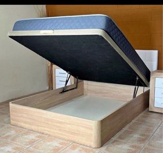 Base de cama con sistema de almacenaje. - Estructura de madera. - Tapizado en tela.
