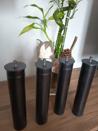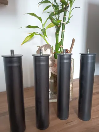 Juego de cuatro patas cilíndricas de color negro, diseñadas para canapés o bases de cama. Cuentan con un tornillo de sujeción en la parte superior. - Material: Metal. - Color: Negro. - Forma: Cilíndrica. - Cantidad: 4 unidades.