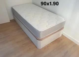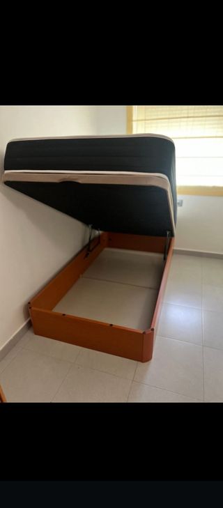 Cama completa con canapé de madera y colchón de 90cm. Está en buen estado y lista para usar. - Incluye canapé y colchón. - Medidas: 90cm.