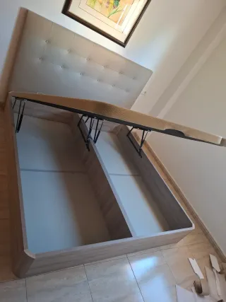 Canapé abatible de gran capacidad, ideal para almacenar ropa de cama y otros objetos. - Estructura de madera. - Tapa tapizada en tejido beige. - Mecanismo de elevación con resortes metálicos. Desmontado listo para recoger en cualquier momento