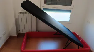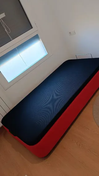 Canapé abatible de madera con tapa tapizada. - Medidas: 135x190 cm. - Estructura de madera. - Tapa tapizada en tela. Me costó 400€ hace 3 meses.