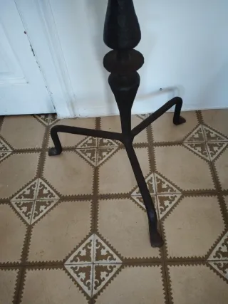 Antiguo candelabro de hierro forjado con un diseño clásico y elegante. - Base de tres patas para mayor estabilidad. - Cuerpo central con detalles decorativos. - Plato superior para velas.