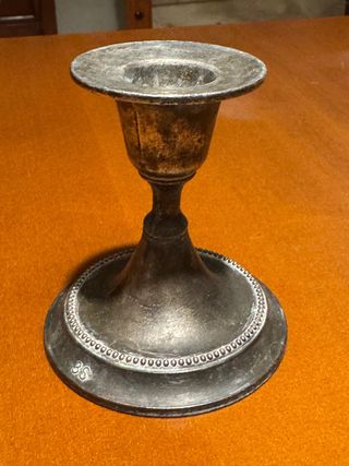 Elegante candelabro antiguo perfecto para añadir un toque de distinción a cualquier espacio. - Base ancha y estable. - Borde decorado con un patrón de cuentas. - Marca 3S grabada en la base. El sello “3S” suele asociarse a plata chapada / silver plate (no ley 925), bastante común en piezas europeas de finales del siglo XIX o principios del XX.