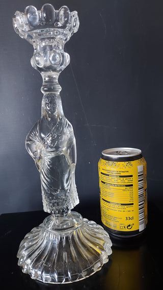 CANDELERO DE CRISTAL PRENSADO, REALIZADO POR LA ANTIGUA FABRICA DE CRISTAL BARCELONESA LLIGE Y CIA. DE MEDIADOS DEL SIGLO XX REPRESENTA UNA FIGURA FEMENINA CON TRAJE TRADICIONAL. ALTURA 27 cm DIAMETRO BASE 12 cm PESO 840 gramos