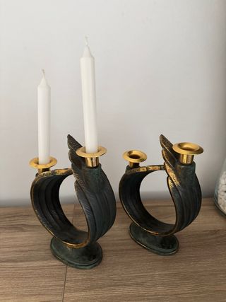Par de candelabros con un diseño elegante y distintivo. - Acabado en tonos dorados y verdosos. - Base y estructura con detalles que evocan plumas. - Soportes para velas en dorado.