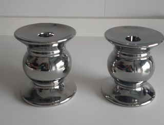 Elegante juego de candelabros con un diseño único. - Fabricados en metal. - Detalles en color rosa. - Disponibles 4 pequeños y dos grandes. - Grande 30 y pequeños 20 euros.