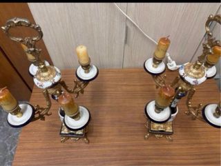 Elegantes candelabros con un diseño clásico y ornamentado. - Acabado en tono dorado. - Fabricado en metal resistente. - Cada uno soporta dos velas o bombillas. Falta la conexión eléctrica como se puede ver en las imágenes.