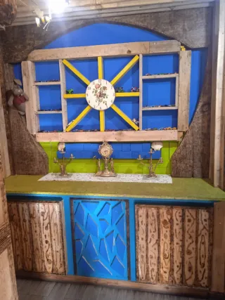 Este candelabro decorativo presenta un diseño celestial con un sol y lunas. - Elaborado con una combinación de metal y madera. - Tonos marrones y multicolor en su acabado.