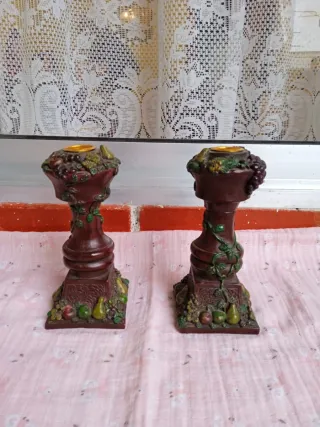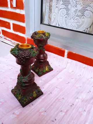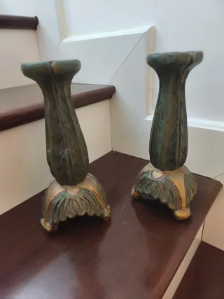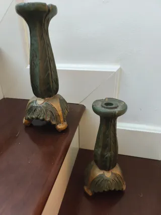 Par de candelabros con un diseño único y elegante, perfectos para añadir un toque especial a tu hogar. Cada pieza ha sido pintada a mano, lo que le confiere un carácter artesanal y distintivo. - Diseño inspirado en hojas y motivos florales. - Acabado envejecido que resalta los detalles. - Base ornamentada para mayor estabilidad y estilo.