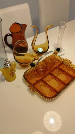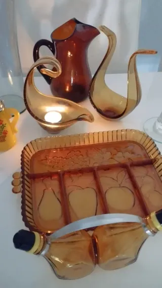 Conjunto de piezas de cristal y vidrio. - REGALO PORRON CATALAN . - Jarra de vidrio ámbar.. - Dos candelabros de vidrio ámbar con forma de cisne... - Bandeja de vidrio ámbar con compartimentos y motivos frutales... - Jarrita amarilla decorada con flores y tapa plateada. Antiguo de Avon cosmética . - Florero de vidrio transparente. Florero individual. Aceitero y vinagre...