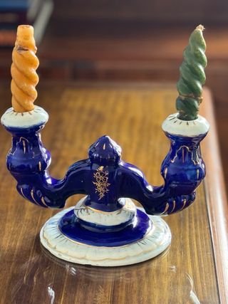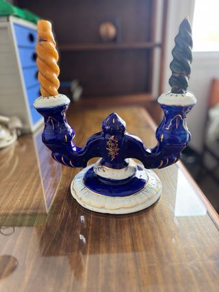 Candelabro doble azul cobalto y oro