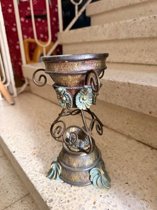 Dos bonitos candelabros- palmatoria vintage con un diseño floral. - Base ancha y estable. - Parte superior para vela. - Esmaltado de flores y hojas. - Acabado metálico.