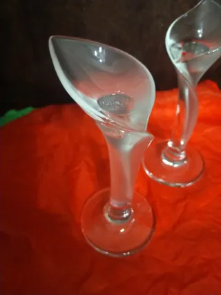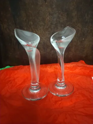 Elegante pareja de candelabros de cristal con un diseño vintage único. Su forma retorcida y base circular aportan un toque de distinción. - Diseño retorcido. - Base circular. - Material de cristal.alta calidad Riedel