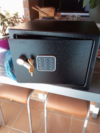 Caja fuerte con cerradura digital y llave de seguridad. - Panel de control con teclado numérico. - Incluye dos llaves. - Diseño moderno y resistente.