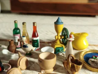 Conjunto de 18 miniaturas antiguas, perfectas para coleccionistas o casas de muñecas. - 3 botellas de plástico duro - cuenco de madera - tazón de porcelana blanco - 2 porrones de madera - zapato de porcelana blanco - pato de madera - duende de madera - ratón de cristal murano - botijo de cristal murano - cesta de cerámica - molinillo de café de plástico rigido - jarra de plástico rigido amarilla - cántaro de barro - biberón de madera - marco dorado con cesta de flores relieve - Variedad de piezas decorativas. - Diseños detallados. - Ideal para ambientar escenarios en miniatura. C166