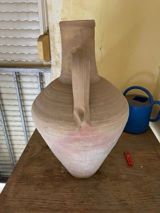 Cántaro/jarra de barro cocido hecho a mano, con dos asas y acabado rústico sin esmaltar. Pieza tradicional de alfarería, ideal como elemento decorativo para casa rústica, casa rural o decoración vintage. Presenta marcas del paso del tiempo propias de este tipo de piezas, que le aportan carácter y autenticidad. No apto para uso alimentario. Perfecto para decoración, flores secas o como pieza ornamental.