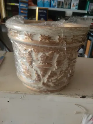 Maceta decorativa con un diseño envejecido y detalles en relieve. Su acabado combina tonos dorados y blancos, aportando un toque elegante.18cm de altura y 22de diámetro - Diseño con relieve. - Acabado envejecido.