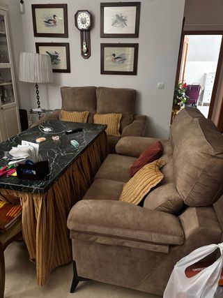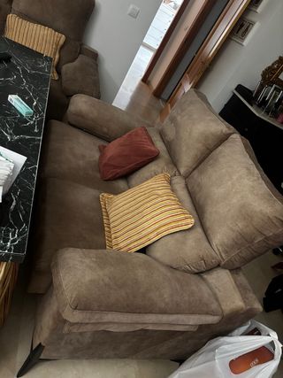 Se vende un conjunto de dos sofás de tela, cada uno de dos plazas. Son cómodos y de un color marrón versátil. - Cada sofá tiene capacidad para dos personas. - El material es tela, ofreciendo un tacto agradable. Comprado hace un año y medio y no ha sido utilizado apenas. En la foto no se aprecia pero el color es mas clarito.