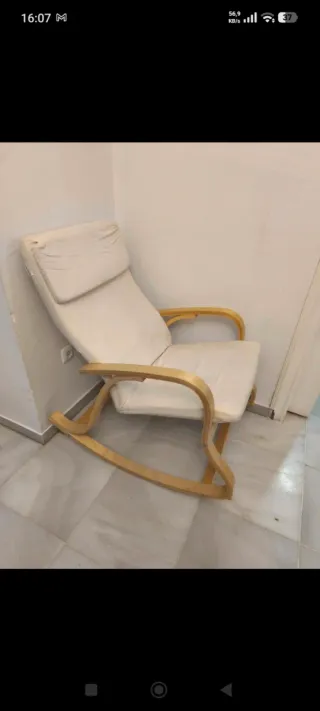 Mecedora beige de tela y madera