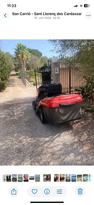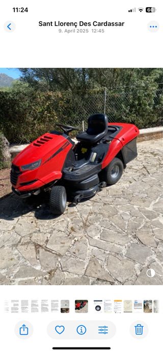 Cortacésped autopropulsado de color rojo, ideal para mantener tu jardín. - Diseño moderno y funcional. - Asiento cómodo para el conductor. - Cesta recolectora de hierba.