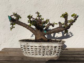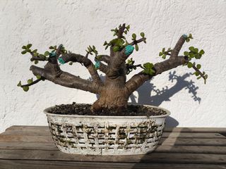 Bonsái de Portulacaria afra, también conocido como Árbol de la abundancia, Arbusto de elefante, Monedita y Jade enano. Portocularia afra / Árbol de la abundancia / Arbusto de elefante. Nebari: 90 mm. Altura x Anchura Bonsai: 20 x 39 cm. Maceta: 25 x 18 x 7,5 cm cesta entrenamiento de plástico. Sustrato: Sustrato universal 90%, Mix pomice y akadama 10% y perlita. Visita nuestra página de Instagram para estar al día de nuestras últimas novedades.