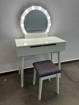 Tocador moderno con espejo circular e iluminación. - Espejo con luces LED integradas. - Acabado blanco brillante. - Dos cajones para almacenamiento. - Patas de madera resistentes.