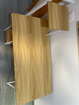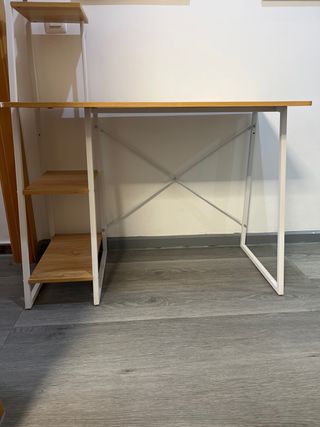 Escritorio moderno con un diseño funcional y elegante. - Estructura principal de metal. - Superficie de madera. - Combinación de colores blanco y color madera la alrura de la repisa lateral es de 42 cm mas