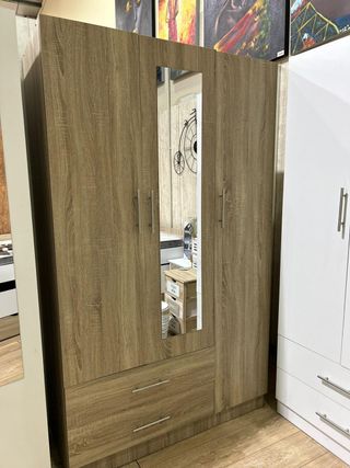 Armario de madera con tres puertas y espejo central. Dispone de dos cajones en la parte inferior. - Acabado en tonos beige y marrón. - Puertas con tiradores metálicos.