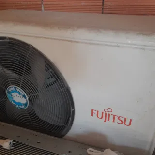 Unidad de aire acondicionado split de la marca Fujitsu. - Unidad exterior con ventilador. - Unidad interior con rejilla frontal.