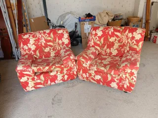 Cómodo sofá de dos plazas con un diseño moderno. - Tapicería de tela. - Color gris neutro. Son dos sofas que tienen 5 años siempre con funda i bien cuidados solo se tendría q cambiar el relleno de los cojines sueltos urge la venta el precio es por los dos
