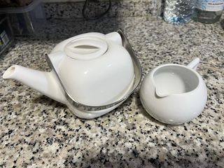 Elegante juego de tetera y jarra para leche, combinando la calidez de la porcelana con el brillo del metal. - Diseño moderno y funcional. - Piezas de porcelana blanca. - Soporte y detalles en metal plateado.