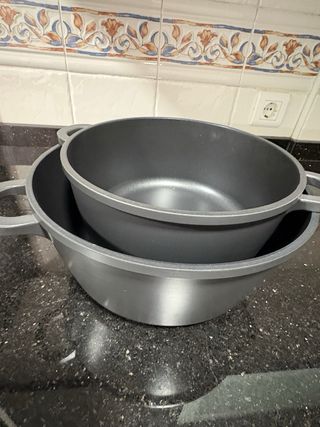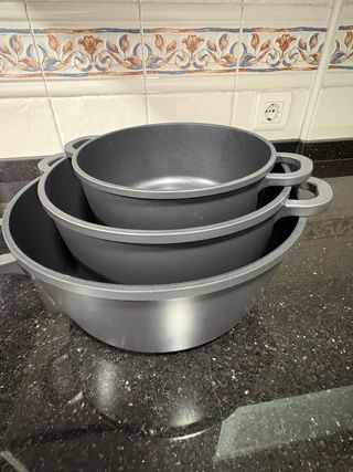 Conjunto de ollas de cocina apilables, perfectas para optimizar espacio en tu cocina. - Diseño moderno en tonos negros y grises. - Fabricadas en metal resistente.