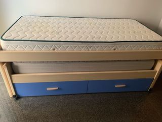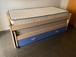 Cama nido con un diseño funcional y moderno, ideal para optimizar el espacio. Las camas son de 90cm - Estructura principal en madera color beige. - Cajones inferiores en color azul. - NO INCLUYE LOS COLCHONES. -Se encuentran en Cullera (Valencia)