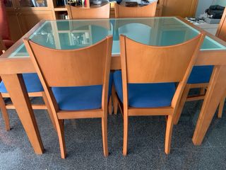 Conjunto de mesa de comedor con sobre de cristal y seis sillas de madera con asientos tapizados en azul. - Mesa con estructura de madera y tapa de cristal. - seis sillas de madera. - Asientos de sillas tapizados en tela azul. Se encuentran en Cullera (Valencia)