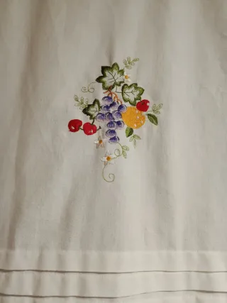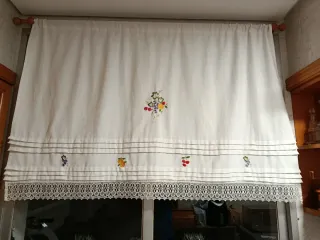 Bonita cortina de cocina con un delicado bordado. - Diseño con motivos de frutas. - Detalle de puntilla en el bajo. - Varios niveles de pliegues o lorzas decorativas.