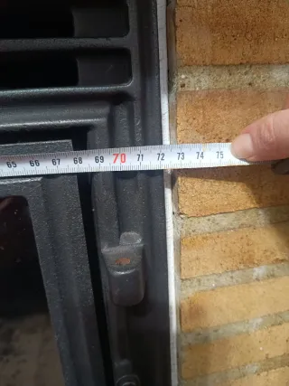 Elegante chimenea de hierro forjado con detalles en madera y piedra. - Marco de madera. - Base de piedra. - Revestimiento de ladrillo.