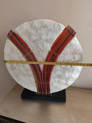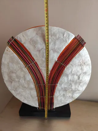 Lámpara de mesa con un diseño único y llamativo, perfecta para añadir un toque de color y estilo a cualquier espacio. - Base de madera. - Pantalla circular con incrustaciones nacar - Detalles en tela y metal.