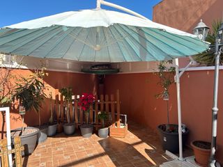 Sombrilla de gran tamaño, ideal para exteriores. Su diseño es elegante y funcional. No tiene las cuatro piezas de la base. Nosotros le poníamos "pías dos porcos" con decoración de flores (hortensias) Quedaba espectacular y el peso era suficiente para que se mantuviera estable (aquí pega o nordés) La vendemos porque es demasiado grande para el espacio donde la queríamos poner. Sólo estuvo colocada una semana de agosto. - Estructura resistente. - Tela de alta calidad. A recoger en Sardiñeiro (Fisterra)